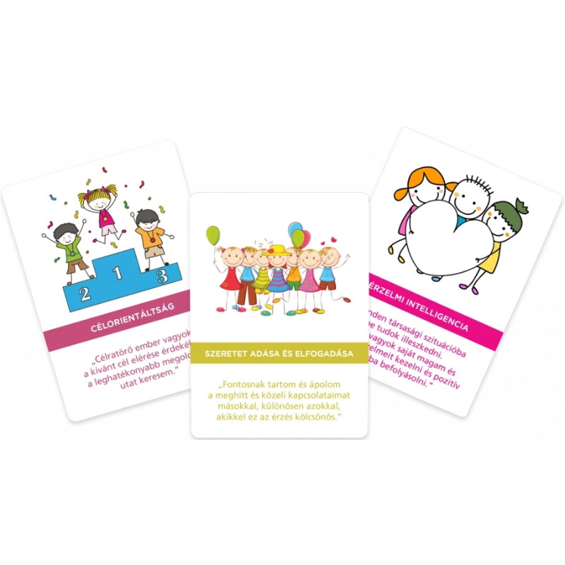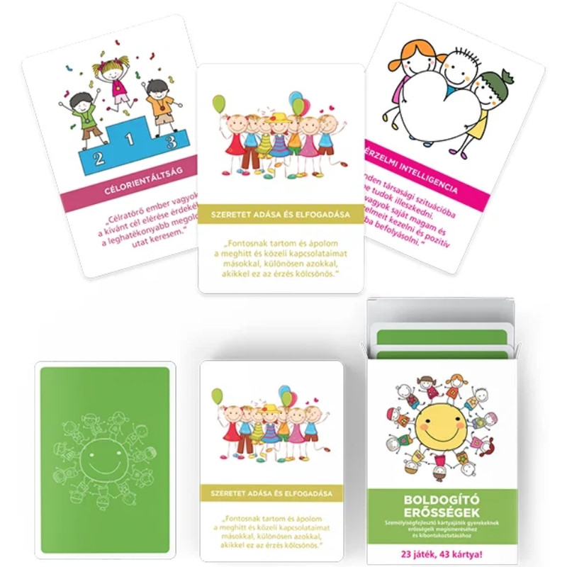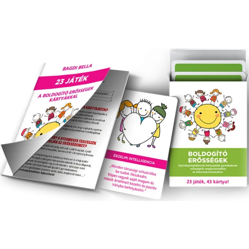 A Boldogító erősségek kártyajáték a pozitív énképet és önbizalmat fejlesztő kártyajáték gyerekeknek 43 gyönyörűen illusztrált kártyával és 23 kreatív, egyszerűen játszható játékötlettel. Az egyre növekvő társadalmi elvárások, az óvodai és iskolai hatások és a felgyorsult életvitel miatt egyre több kisgyerek szorong már egészen fiatal korban. Az őket érő negatív élmények pedig az önbecsülésükben és az önbizalmukban is éreztetik hatásukat. Emiatt a gyerek bátortalanok, türelmetlenek és távolságtartóak lehetnek. Szerencsére szülőként, nevelőként és pedagógusként lehetőséged van rá, hogy odafigyeléssel és az erősségeik révén megélt pozitív érzésekkel mindezt kompenzáld. A türelem, a nyitottság, a kíváncsiság, a kitartás, a humor, a szenvedély, a gyakorlatiasság, a célorientáltság, a megbízhatóság vagy az optimizmus mind olyan emberi tulajdonságok, amelyeket a gyerekeknek kívánunk. A Boldogító erősségek kártyajáték pedig segít a meglévő gyökereket valódi erősségekké alakítani.