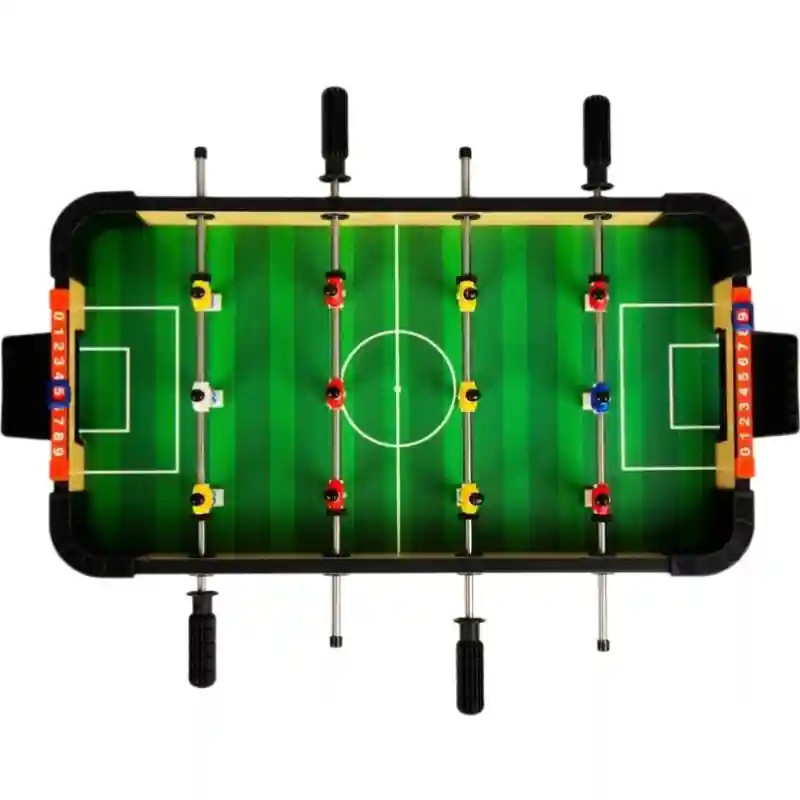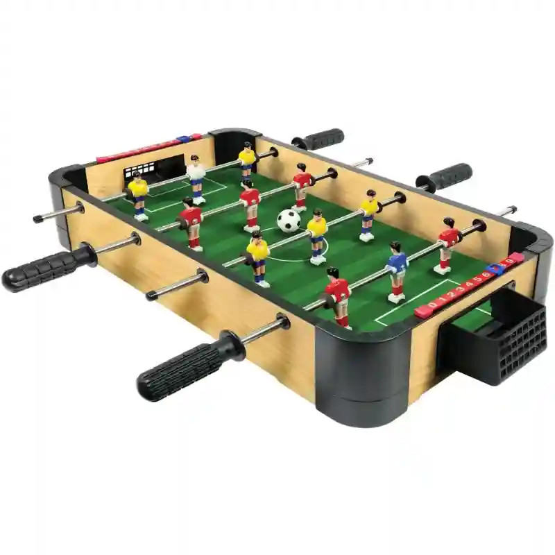 Ez a kompakt méretű, fából készült asztali csocsó tökéletes választás otthoni játékhoz vagy akár útközbeni szórakozáshoz. Kis méretének köszönhetően bármilyen sík felületen könnyedén felállítható, így ideális gyors mérkőzésekhez két játékos számára. A klasszikus kialakítású, masszív fa asztal tartós és stabil játékélményt biztosít. A négy játékossor, soronként három figurával, izgalmas és dinamikus játékmenetet tesz lehetővé, miközben a játékosok passzolhatnak, védekezhetnek és gólt szerezhetnek egymás ellen. A manuális csúszkás pontszámlálók segítségével egyszerűen követhető az állás minden mérkőzés során. A szett két labdát is tartalmaz, így azonnal elkezdhető a játék. A kb. 51 × 31 × 10 cm-es méret könnyű tárolást és szállítást tesz lehetővé, így használat után egyszerűen elrakható, majd bármikor újra elővehető. 3 éves kortól ajánlott, és nemcsak gyerekeknek, hanem felnőtteknek is remek szórakozást nyújt. Tökéletes választás baráti összejövetelekhez, családi játékhoz vagy egy gyors, izgalmas párbajhoz.