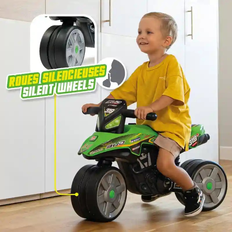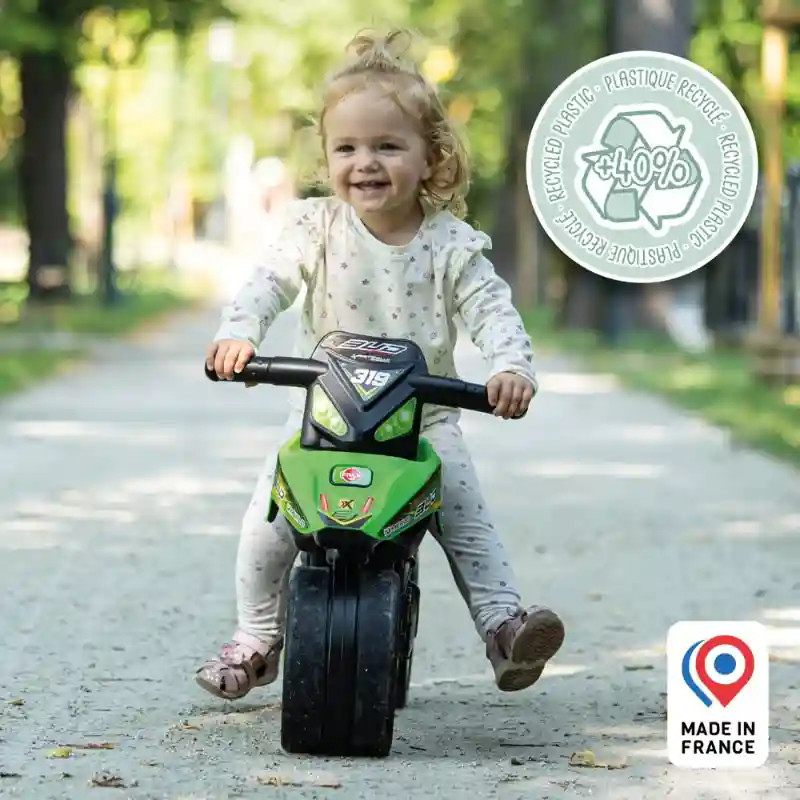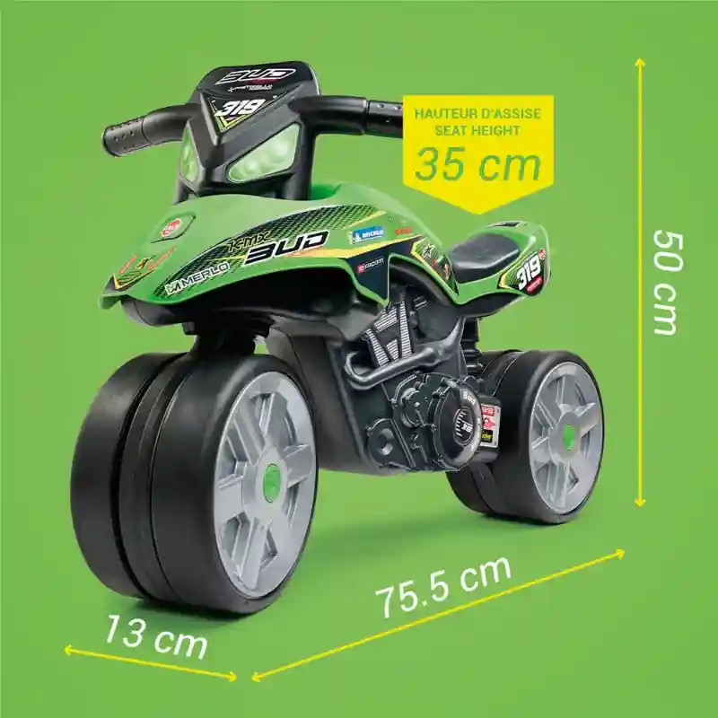 Ez a látványos kormányozható Falk K-MX Bud Racing Team motor bébitaxi tökéletes választás a kis motorrajongók számára, akik szeretnék kipróbálni az első „vezetési” élményeiket. A modell a versenymotorok világából merít inspirációt, így igazi sportos hangulatot visz a mindennapi játékba. A lábbal hajtható kialakítás természetes mozgásra ösztönzi a gyerekeket, miközben fejleszti az egyensúlyérzéket és a motorikus készségeket. A széles kerekek stabil alapot biztosítanak, így a kicsik biztonságosan gyakorolhatják a közlekedést, akár beltéren, akár a szabadban. A csendes, „néma” kerekek különösen praktikusak beltéri használat során, mivel nem zavarják a környezetet. A masszív szerkezet és a kormányrúd segíti az irányítást, így a gyerekek könnyedén manőverezhetnek. A kb. 75,5 × 40 × 50 cm-es méret és a 35 cm-es ülésmagasság ideális a 2–5 éves korosztály számára, maximális terhelhetősége 30 kg. Ez a strapabíró és stílusos gyermek motor remek társ a mindennapi kalandokhoz, miközben játékosan fejleszti a mozgást és önbizalmat ad a kicsiknek.