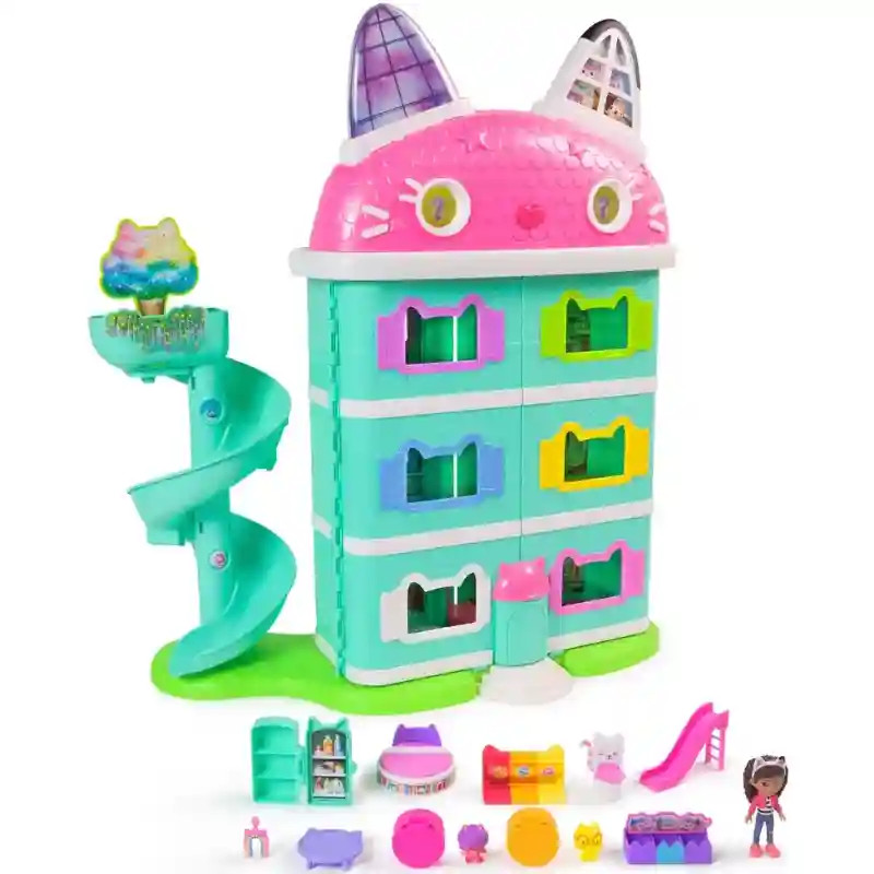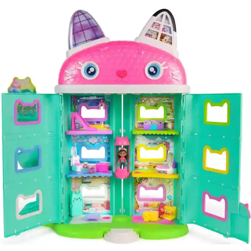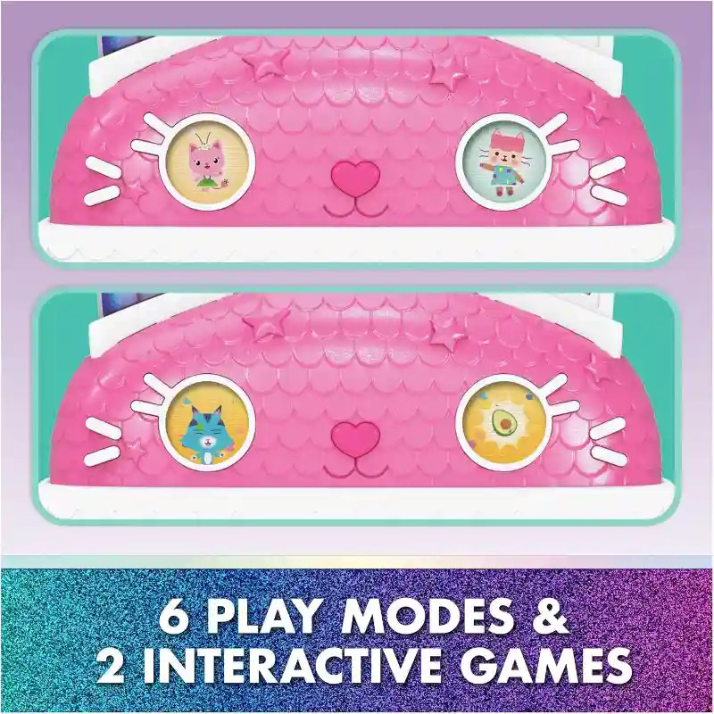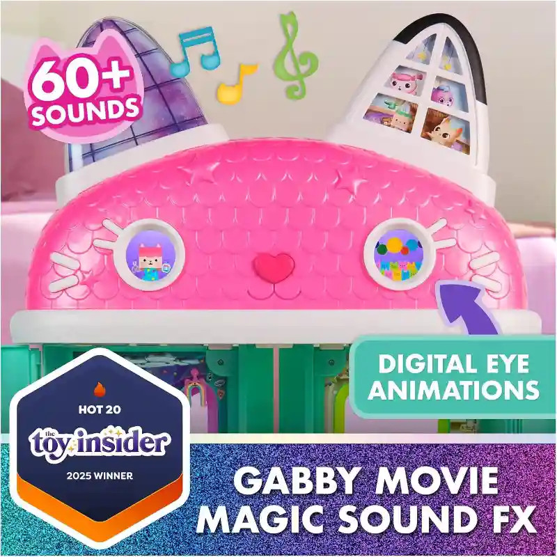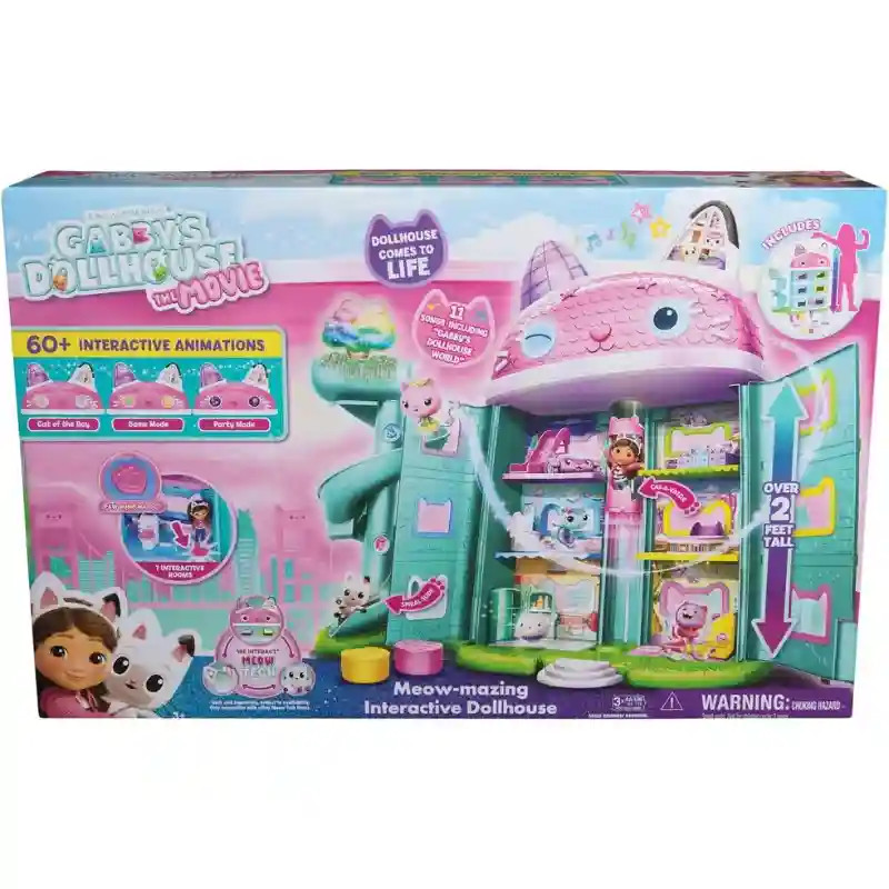 A Gabi babaháza: A film - Gabi Meow-mazing interaktív babaháza minden kis Gabby-rajongó álma. Több mint 60 animációval és hanghatással (angol nyelven!), 7 szobával és különleges meglepetésekkel ez a babaház szó szerint életre kel a játék során. A gyerekek Gabby orrát megnyomva, varázsgombokat aktiválva vagy az interaktív lifttel utazva fedezhetik fel a ház minden részét. A LCD-szemek és az aranyos cicahangok még valóságosabbá teszik az élményt. A ház kompatibilis a Gabby interaktív fejpánttal és a Pandy Paws interaktív karkötővel (külön kaphatók!). Ezek együttműködnek a Meow Tech rendszerrel, így az eszközök egymásra reagálnak – interaktív élményt teremtve. A több mint 60 cm magas babaházban 7 különböző helyiség található, spirálcsúszdával a Dollhouse Delivery dobozokhoz, bútorokkal és aranyos dekorációkkal – minden adott egy igazi Gabby-kalandhoz. A Gabby’s Dollhouse világának bővítésével a gyerekek saját történeteket találhatnak ki, miközben fejlődik képzelőerejük, kommunikációjuk és szerepjáték készségük.