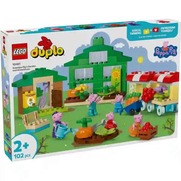 Ez a LEGO® DUPLO 10461 Peppa malac - Nagypapi kertje és üvegháza építőkészlet a 2 éves és annál idősebb kisgyermekek számára készült, és játékos formában vezeti be őket a természet és a gondoskodás világába. A szett a népszerű Peppa Pig szereplőivel kelti életre a kertészkedés örömét, miközben fejleszti a kicsik képzelőerejét és kreativitását. A készletben Peppa, George, Mami Malac, Papi Malac és Nagypapa Malac figurái segítik a gyerekeket abban, hogy vidám családi kalandokat éljenek át a kertben. A megépíthető fészer, az üvegház, a mozgatható talicska, a kerti szerszámok, valamint a gyümölcs- és zöldségfigurák változatos játékélményt biztosítanak, miközben ösztönzik az érzékszervi felfedezést. A szerepjáték során a gyerekek megtanulhatják az ültetés, locsolás és betakarítás alapjait, miközben fejlődik empátiájuk és finommotoros készségük. A mozgatható elemek segítik a kéz-szem koordináció fejlődését, és támogatják az önálló játék kialakulását. Ez a LEGO DUPLO szett ideális ajándék minden Peppa Pig rajongó kisgyermek számára, akik szeretnek alkotni, felfedezni és a természethez kapcsolódó történeteket kitalálni. A játék nemcsak szórakoztató, hanem értékes tanulási élményt is nyújt, amely hozzájárul a korai fejlődési mérföldkövek eléréséhez. A készlet a LEGO DUPLO termékcsaládjának részeként biztonságos, tartós és kisgyermekek számára tervezett elemekből áll, így hosszú távon is megbízható társa lehet a mindennapi játéknak.