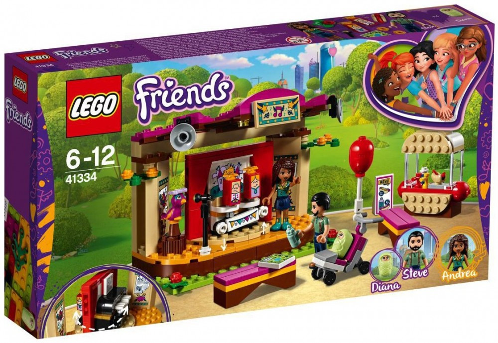 Ez a vidám LEGO Friends 41334 Andrea előadása a parkban játékszett Andrea és Steve figuráival, valamint a kis Diana babával és Pepper madárkával igazi családi hangulatot teremt. A központi elem egy különleges marionettszínház, amelyhez két cserélhető háttér tartozik, így a gyerekek mindig új előadásokat találhatnak ki. A mozgatható bábuk és a kulisszák mögötti zongorabillentyűk segítségével a figurák „életre kelnek”, és táncolni kezdenek. A történetek még színesebbé válnak a kiegészítőknek köszönhetően, mint a mikrofon, a lufi, a hotdog, az árlista, a cumisüveg és a Heartlake City Park térképe. A babakocsis séta, majd az előadás megtekintése remek lehetőséget ad a szerepjátékra és a mindennapi helyzetek feldolgozására. A forgatható díszletnek köszönhetően a színpad pillanatok alatt átalakítható, így mindig új hangulatú műsor születhet. A készlet ösztönzi a fantáziát, a történetmesélést és a kreatív gondolkodást.