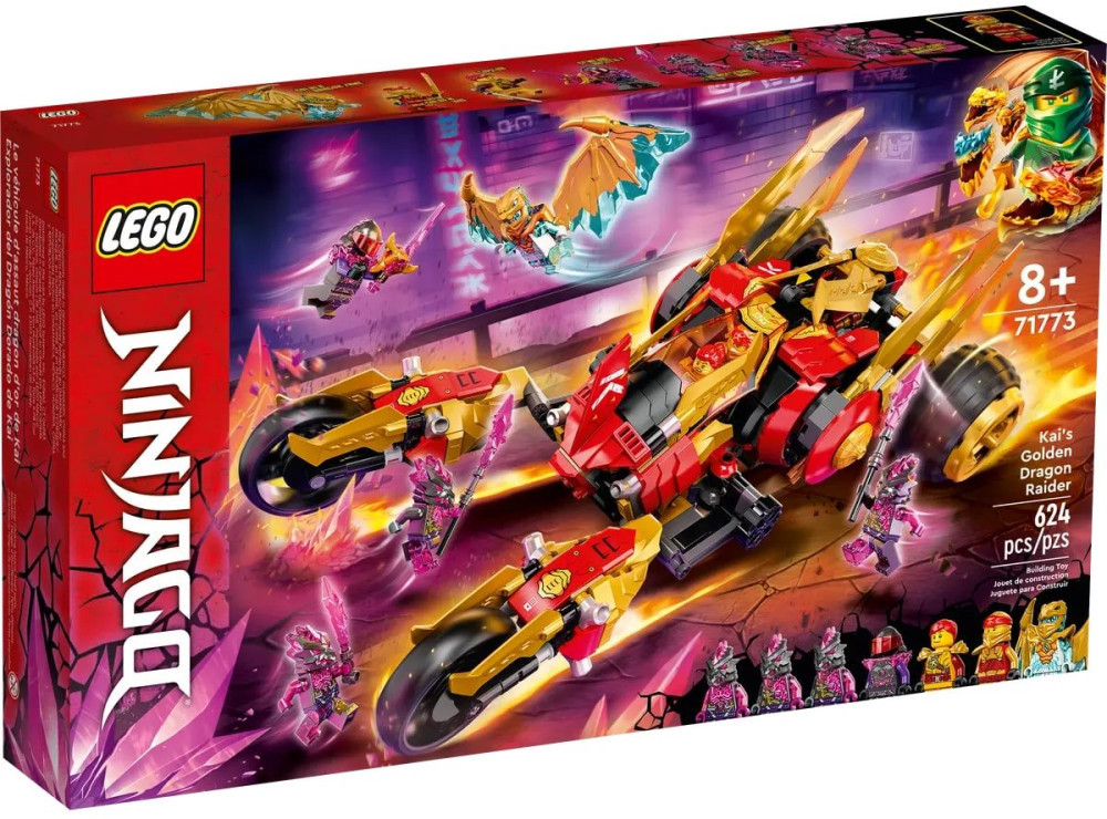 Ez az akciódús LEGO NINJAGO 71773 Kai aranysárkány járműve játékszett garantáltan elnyeri a rajongók tetszését, hiszen 7 minifigurát, köztük 2 aranyszínű figurát és rengeteg fegyvert tartalmaz az izgalmas csatákhoz. A készlet egy különleges NINJAGO járművet foglal magában, amely számos funkcióval rendelkezik: pilótafülke, két ágyú négy kilövóval, valamint arany sárkánypengék teszik még látványosabbá a játékot. A hátsó kerekek áthajtásával az autó közúti módból „járó” üzemmódba alakítható, így négylábúként mozoghat, miközben segít megszerezni Zane elementáris fegyvereit. A szett 7 LEGO NINJAGO minifigurát tartalmaz, többek között Golden Kai-t, aranysárkány-szárnyas Zane-t és Skylor-t. Az ellenfelek oldalán megtalálható General Mr. F, egy Vengeance Stone harcos és két további bosszúkő-katona is, akik számos menő fegyverrel érkeznek a küzdelemhez. A LEGO NINJAGO játékok széles választékot kínálnak – robotokat, autókat, repülőket, sárkányokat és templomokat –, amelyek mind a Ninjago: Masters of Spinjitzu világába repítik a gyerekeket. Kai aranysárkányos járgánya nemcsak játék közben nyújt élményt, hanem kiállítva is látványos dísze lehet a gyerekszobának. Ez a készlet tökéletes ajándék minden 8 év feletti gyermek számára, aki rajong a nindzsákért, a kalandokért és a LEGO NINJAGO univerzumért.