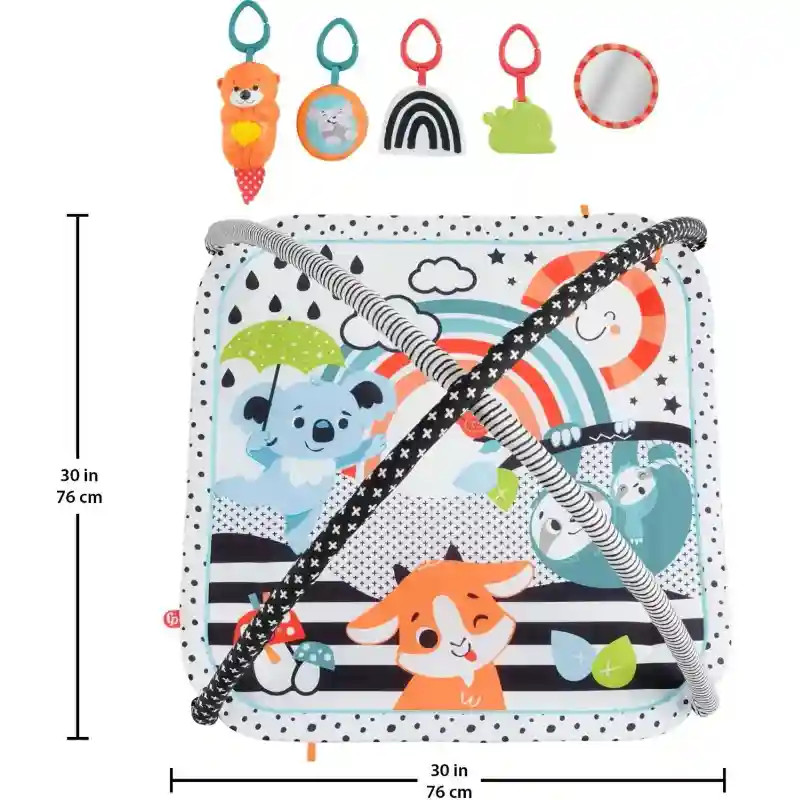 A Fisher-Price Nőj velem 3 az 1-ben játszószőnyeg a legmegfelelőbb hely, ahol a kicsik eltölthetik a játékidejüket. A babák 5 összekapcsolható aktivitási játékot érhetnek el, ütögethetnek és ragadhatnak meg, köztük egy tükröt, egy puha csörgős sünijátékot, egy BPA-mentes csigás rágcsálót, egy gyűrődő szivárványos játékot és egy zenélő és világító vidrát. A zenélő és világító vidra tizenöt percnyi zenét játszik, és lágyan világító fénnyel világít. A fekete-fehér kontrasztja, és a vonalak ritmikus változása segíti a látás fejlődését. Előbbi a szem fókuszálásának képességét, az éleslátás kialakulását, utóbbi a szemmozgásokat, illetve a mozgó tárgyak követésének képességét fejleszti. A babák látása fokozatosan fejlődik. Észlelésük kezdetben homályos, de hamarosan képesek lesznek fókuszálni a környezetükben felbukkanó dolgokra. Figyelmüket leginkább a kontrasztos színek, legfőképpen a fekete-fehér vonzzák. E színek célja, hogy a babák idegrendszerét stimulálja, megteremtve így a lehetőséget a megfelelő idegkapcsolatok (szinapszisok) kiépülésére. A Fisher-Price Nőj velem 3 az 1-ben játszószőnyeg játékokkal, hangokkal és zenével foglalja le a babát! Több összekapcsolható játék, egy tükör és egy imádnivaló, levehető, zenélő és világító vidra mókás hangokkal, fényekkel és lágy zenével segít, hogy a kisbaba elfoglalja magát a kényelmes, párnázott, hordozható játszószőnyegen, mely felett két puha, levehető játékív is található. Hosszú lejátszás módban akár 15 percen át zenél és az összekapcsolható játékok áthelyezhetők, hogy kisbabának minden alkalommal más és más élményben legyen része! A Fisher-Price Nőj velem 3 az 1-ben játszószőnyeg kontrasztos színei fejlesztik a kicsik látását is. A játszószőnyeg mosógépben mosható és összehajtva bárhová magunkkal vihetjük.