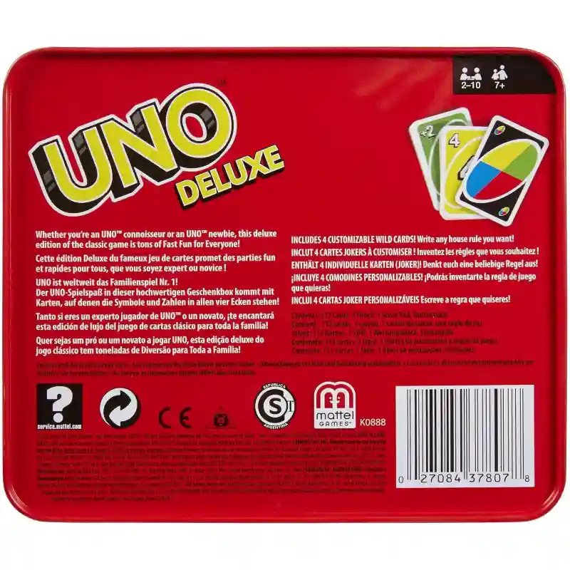 Az UNO Deluxe egy klasszikus és rendkívül népszerű kártyajáték, amelyben 2–10 játékos mérheti össze tudását egymással vagy akár csapatokban. A játék gyors, izgalmas és könnyen megtanulható, így minden korosztály számára remek szórakozást kínál. A játék célja, hogy a játékosok minél gyorsabban megszabaduljanak az összes lapjuktól. Amikor valakinek már csak egy kártya marad a kezében, hangosan ki kell mondania: „UNO!”. Ha ezt elfelejti, könnyen előnyhöz juttathatja az ellenfeleit. A kártyákon különleges grafikai jelölések is találhatók, amelyek segítik a színek felismerését, így a színtévesztő játékosok számára is könnyebbé válik a játék. A készlet egy színes, strapabíró fémdobozban érkezik, amely praktikus tárolást biztosít, és ideális utazáshoz vagy ajándéknak is. Az UNO mindenki kedvence lehet – gyerekek, tinédzserek és felnőttek egyaránt élvezik. Ha egyszer elkezdődik a játék, nehéz abbahagyni.