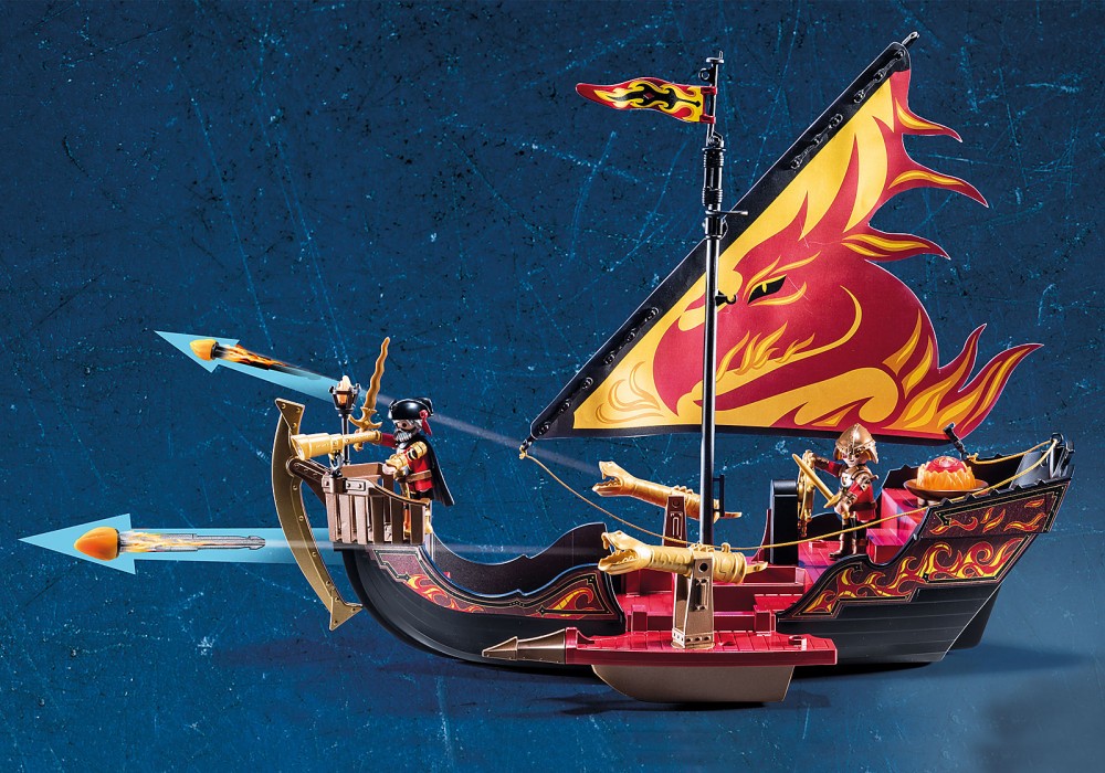 A Burnham harcosok a vitorlás tűzhajó fedélzetén indulnak csatába a mágikus páncélért. A Burnham vitorláshajó uralja a veszélyes vizeket. Ha ellenség közeledik, az ágyúkat villámgyorsan tüzelőállásba helyezik. Ha a hajó elég közel kerül a célponthoz, a lovagok a hajó orrában lévő kampó segítségével tartják sakkban az ellenséget. A forrófejű Bayron a hajó kapitánya, aki éppen a különleges iránytűt tanulmányozza, hogy megtalálja a helyes irányt a mágikus Invincibus páncélhoz. Vajon az iránytű elvezeti a céljához? A játékkészlet tartalmazza a lázadó lovagokat, Bayron Burnham és Archibald Blazebow karaktereit, egy tűzhajót ágyúkkal, sárkányvitorlákkal és egy különleges iránytűvel. A hajó orrán lévő sarló ütközőként, vagy támadó fegyverként is használható. A vitorlás hajó a Playmobil 5159 Víz alatti motorral bővíthető.