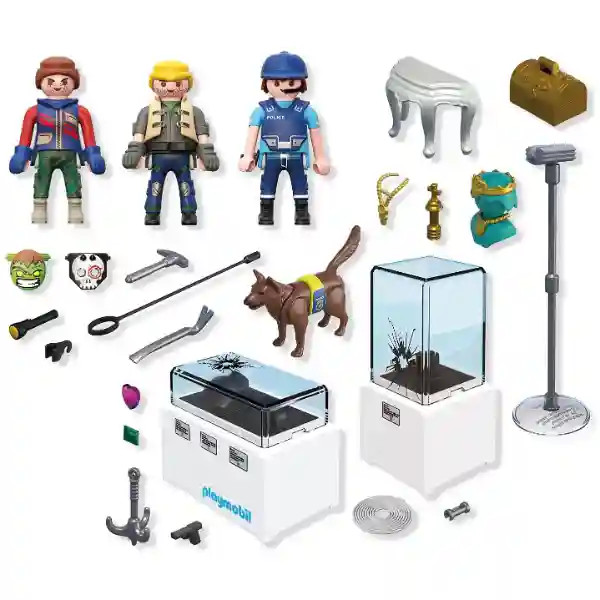 Playmobil 71876 Gyémántrablás: éjszaka csendben lopakodik be két álarcos tolvaj a múzeumba, hogy megszerezze a csillogó ékszereket és a királyi koronát. A zsákmány már a zsákjukban van, amikor a riasztás után megérkezik a rendőr és hűséges szolgálati kutyája. Vajon sikerül elmenekülniük a kötélen át, vagy a törvény őrei időben megállítják őket? Ez az izgalmas szett tartalmaz 3 figurát – 1 rendőrt, 2 tolvajt – valamint egy éber rendőrkutyát. A valósághű kiegészítők mint az ékszerek, korona, zsák, valamint egy horgony kötéllel, amellyel a tolvajok látványosan menekülhetnek, még élvezetesebbé teszik a játékot. A tolvajok maszkjai levehetők, így még izgalmasabb a szerepjáték. A készlet lehetőséget ad a feszültséggel teli bűnügyi jelenetek, üldözések és hősi rendőrakciók eljátszására. A Playmobil 71876 Gyémántrablás szett tökéletes választás mindazoknak, akik szeretik a bűnügyi kalandokat, az izgalmas üldözéseket és a részletgazdag szerepjátékot.