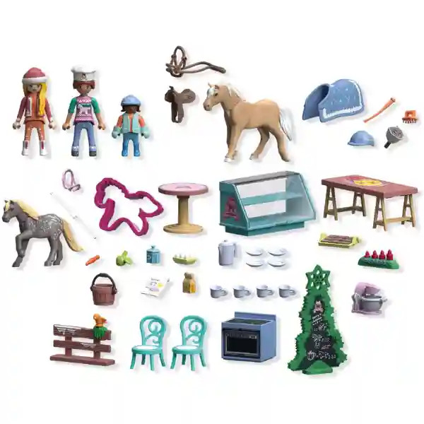 Playmobil 71952 Karácsony - Horses of Waterfall adventi kalendárium, naptár - Lovaskávézó: közeleg a karácsony Waterfallban, és Ellie kis, hangulatos lovaskávézójából máris ellenállhatatlan sütemény- és puncsillat árad. Ellie szorgosan sütögetett, a lovak számára is finom falatok várnak – és a legjobb: a szettben található gyönyörű ló alakú süteményszaggatóval otthon is megsüthetők a karácsonyi kekszek! Az Ellie ünnepi lovaskávézója a PLAYMOBIL-től a karácsonyi varázst és a vidéki bájt ötvözi. A gyerekek süteményeket és mézeskalácsokat süthetnek a nyitható sütőben, majd szeretettel tálalhatják őket. A pult egyénileg díszíthető és feltölthető, a vitrint fel lehet nyitni, így minden játékhelyzet még életszerűbbé válik. A szettben nemcsak a kávézó mindennapjai kelnek életre, hanem aranyos állatok, ünnepi kiegészítők és egy igazán szívmelengető hangulat is várja a gyerekeket. Tökéletes választás kis cukrászoknak, állatbarátoknak és mindazoknak, akik szeretnének varázslatos karácsonyi történeteket eljátszani PLAYMOBIL stílusban.