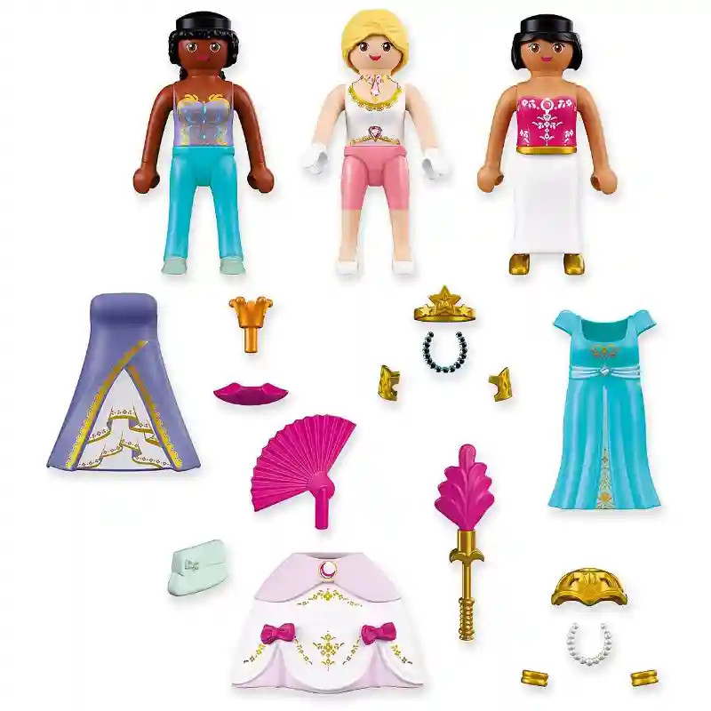 A Playmobil 72055 Hercegnők készlet hívja a gyerekeket fantáziadús stylingkalandokra és igazi királyi játékélményre. A ruhák, szoknyák és csillogó kiegészítők szabadon cserélhetők és kombinálhatók, így mindig új megjelenések születhetnek bálokra, sétákra vagy a kastélykertben megrendezett találkozókra. A PLAYMOBIL szett fejleszti a kreativitást, ösztönzi a szerepjátékot és támogatja a társas interakciót, miközben tökéletes kiegészítője bármely PLAYMOBIL Princess világnak. A három figura számtalan öltöztetési lehetőséget kínál, így a gyerekek kedvük szerint variálhatják a ruhadarabokat és ékszereket. Az új kombinációk nemcsak változatos megjelenéseket eredményeznek, hanem minden alkalommal új történeteket is inspirálnak. A játék során fejlődik a finommotorika, az önálló döntéshozatal és a kreatív gondolkodás, hiszen minden öltözék más hangulatot és szerepet ad a hercegnőknek. A közös játék még élvezetesebbé válik, amikor a hercegnők beszélgetnek egymással, ünnepségeket szerveznek vagy együtt sétálnak a kastély körül. Ez segíti a kommunikációs készségek fejlődését és erősíti a szociális kompetenciákat. A legyezők, koronák és ékszerek különleges ragyogást kölcsönöznek minden jelenetnek, így a gyerekek saját, bájos divattörténeteket alkothatnak újra és újra. Ideális ajándék mindazok számára, akik szeretik a meséket, a divatot és a kreatív történetmesélést.