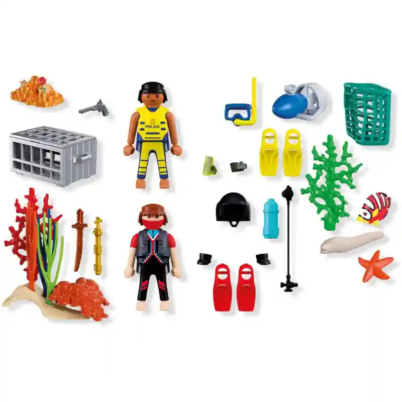 A Playmobil 72078 Rendőrségi búvár kincsekkel készletben a tolvaj attól tart, hogy zsákmányát a szárazföldön azonnal felfedezik, az arannyal és gyémántokkal teli kincset, valamint a fegyvereket biztonságosan elrejti a tenger mélyén, a vízinövények között. Az éber rendőrbúvár azonban már a nyomában van, és víz alatti robogójával villámgyorsan szeli át az óceán mélységeit, hogy felkutassa a menekülőt és a rejtett zsákmányt. Miután megtalálja a kincset, rögzíti azt a járművéhez, majd biztonságosan visszaszállítja a partra. A küldetés végén leveszi az uszonyokat, karvédőket, búvárszemüveget és sisakot, és megpihen egy sikeres akció után. Az üldözés véget ér, de a kaland csak most kezdődik igazán. A megszerzett kincsesláda után a rendőrbúvár felfedezheti a színes korallzátonyokat, a kíváncsi tengeri élőlényeket és a mélység rejtett zugait. A gyerekek újraélhetik az izgalmas hajszát, vagy saját, egyedi küldetéseket találhatnak ki, miközben a kincset hálóban vagy ládában szállítják tovább a búvárrobogón. Ez a részletgazdag PLAYMOBIL játékszett tengeri élőlényekkel, növényekkel, csillogó zsákmánnyal és két figurával kínál határtalan víz alatti szórakozást. Tökéletes választás minden kis kalandornak, aki szereti az izgalmas történeteket és a kreatív szerepjátékot.