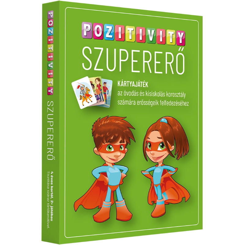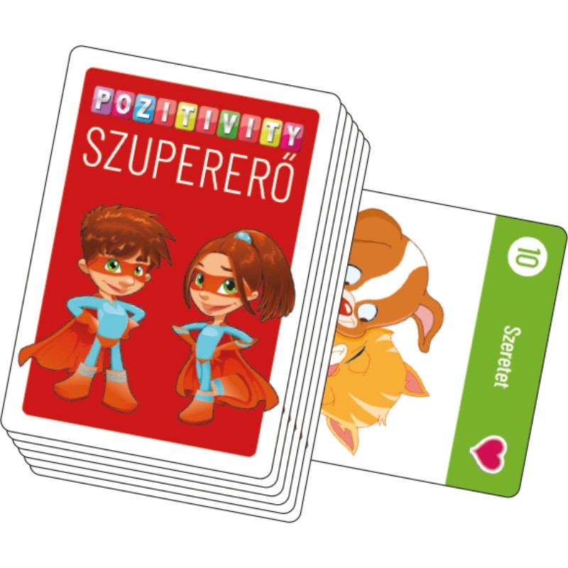 A Pozitivity Szupererő kártyajáték a 24 karaktererősség kártyajátéka, amivel minden kisgyermekből valódi szuperhős válhat. Több mint 50 kutató részvételével állították össze azt a listát, ami a 24 karaktererősséget, vagyis a legfőbb pozitív emberi tulajdonságokat tartalmazza. A karaktererősségek tehát azok a pozitív jellemvonások, amelyek egyrészt a saját javunkra, másrészt pedig a körülöttünk élők javára válhatnak. Mind a 24 erősség megvan mindenkiben, csak épp különböző mértékben. A Pozitivity Szupererő kártyák abban segítenek, hogy az óvodás / kisiskolás gyermekek már igen fiatalon felismerhessék a saját erősségeiket, amelyekre építkezve boldog és sikerekben gazdag életet élhetnek..