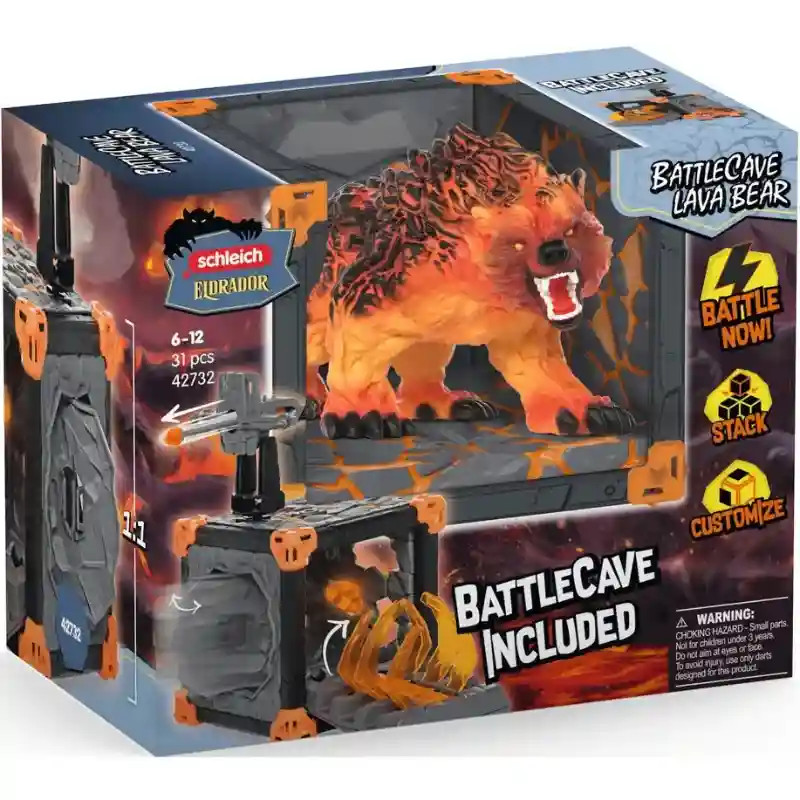 Schleich 42732 BattleCave lávamedve: a félelmetes lávamedve éberen őrzi a BattleCave-et, ahol a felbecsülhetetlen értékű Lávavilág kristálya rejtőzik. Aki meg akarja szerezni, annak előbb szembe kell néznie a medvével, amelynek tüzes bundája és borotvaéles fogai minden támadót megfélemlítenek. Vigyázat! A lávamedve ugrásra készen áll, és könyörtelenül lecsap az ellenségre. A barlang védelmét tovább erősíti a tetőn elhelyezett lövőállás: az előkészített számszeríj bármikor tüzelésre kész. Az ELDRADOR® CREATURES BattleCaves játékszettek a gyerekszobát pillanatok alatt izgalmas csatatérré változtatják. A különböző BattleCave-ek összekapcsolhatók, így végtelen akció és változatos játéklehetőség vár a gyerekekre. Ravasz csapdák, látványos összecsapások és epikus párbajok teszik teljessé az élményt az Eldrador Arénában. Ki meri vállalni a kihívást, és szembeszállni a lávamedvével ebben a lélegzetelállító csatában? A szett remekül kombinálható a Schleich BattleCave további készleteivel.