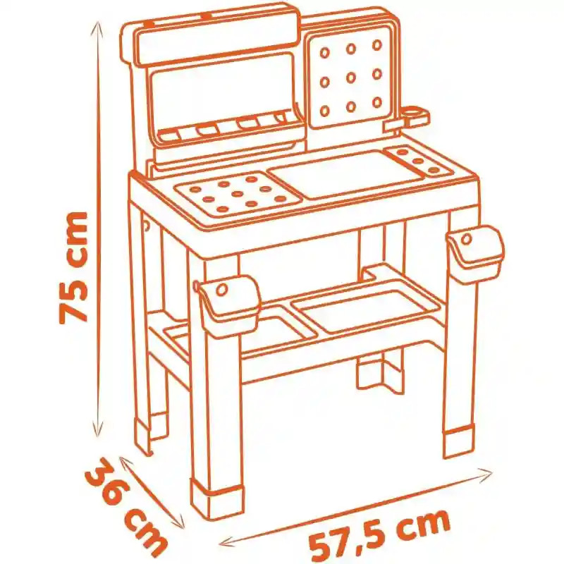 A Smoby Black & Decker Bricolo Pro játék szerelőasztal valósághű játék munkapadja mindent tartalmaz, amire egy kis ezermesternek szüksége lehet, a fűrésztől a kalapácson át egészen a saját, mechanikus csavarozóig. Fűrész, kalapács, csavarhúzó, csőfogó, kombinált fogó, villáskulcs és satu, minden eszköz kéznél van a fantáziadús barkácsjátékhoz. A változatos kiegészítőknek köszönhetően a gyerekek járműveket rakhatnak össze, különböző tárgyakat építhetnek, vagy akár „beverhetik a szögeket” a kalapálófelületen. A tágas tárolópolcok, két tárolódoboz és a szerszámfal gondoskodnak arról, hogy minden szerszámnak meglegyen a helye. A munkapad 60%-ban újrahasznosított műanyagból készült, Franciaországban, így nemcsak szórakoztat, hanem a környezetet is védi. Szuper ajándék minden 3 év feletti kis barkácsmester számára, aki szeretne saját műhelyben alkotni és szerelni! A munkafelület magassága kb. 50 cm. A termék összeszerelést igényel.