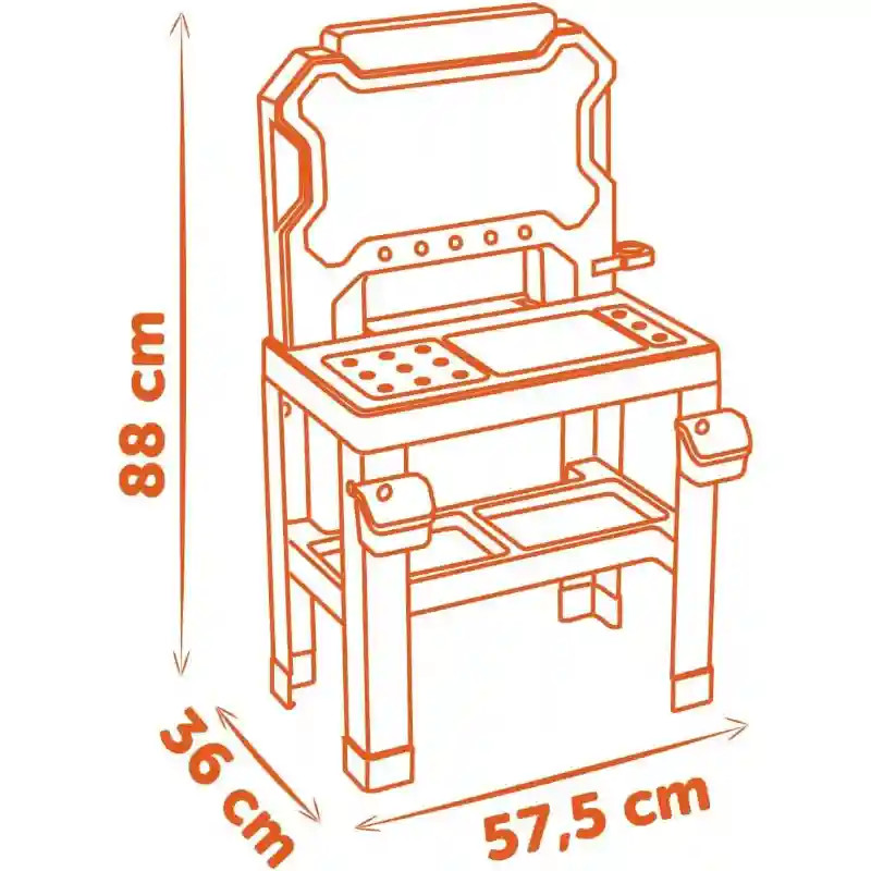 A Smoby Black & Decker Bricolo játék szerelőasztal minden kis ezermester álma, tele szerszámokkal és izgalmas kiegészítőkkel, amelyekkel órákig tartó kreatív játék garantált. Fűrész, kalapács, csavarhúzó, fogó, villáskulcs, derékszög és satu, minden megvan, ami a nagy munkákhoz kell! Csavarok, építőlemezek és sok más kiegészítő, amivel a gyerekek építhetnek, szerelhetnek és fantáziájukat használva új alkotásokat hozhatnak létre. A tágas tárolófelületek, két tárolódoboz és a szerszámfal segítenek, hogy minden szerszámnak meglegyen a helye, így a műhely mindig rendezett marad. A munkapad 70%-ban újrahasznosított műanyagból készült, Franciaországban, így nemcsak szórakoztat, hanem a környezetet is védi. Szuper ajándék minden 3 év feletti kis barkácsmester számára, aki szeretne saját műhelyben alkotni és szerelni! A munkafelület magassága kb. 50 cm. A termék összeszerelést igényel.