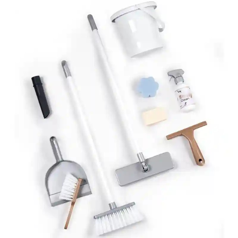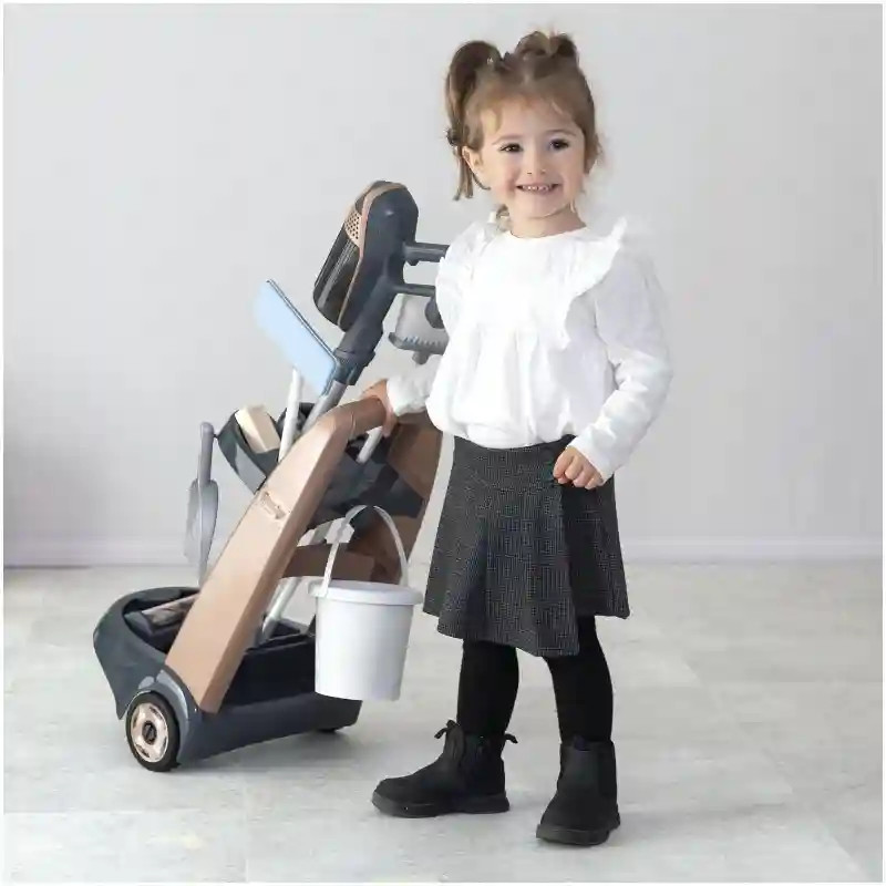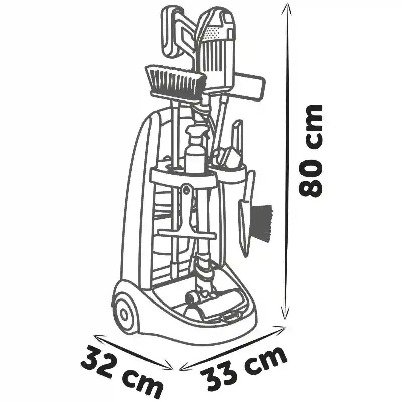 A Smoby Rowenta játék gurulós takarítókocsi elektronikus rúdporszívóval készlet tökéletes felszerelést biztosít a gyerekeknek, hogy játék közben „ragyogóvá varázsolják” a házat vagy a lakást. A készlet központi eleme egy vezeték nélküli játék porszívó, amely a Rowenta X Force Flex modell hű másolata. A porszívó egy gomb megnyomásával működésbe lép, és valósághű szívóhangot ad ki. A hosszú nyéllel álló porszívóként használható, de a nyél eltávolításával kézi porszívóként is működik. A csomag egy extra szívófejet is tartalmaz. A játék működéséhez szükséges 3db LR44 gombelemet a csomagolás tartalmazza, így a porszívó azonnal használható. A takarítókocsi számos további kiegészítőt is tartalmaz, például seprűt, kefét, lapátot, felmosót, permetező flakont, szappant, szivacsot, vödröt és ablaklehúzót. Így a gyerekek játékosan segíthetnek a szülőknek a takarításban, miközben fejlesztik képzelőerejüket és szerepjátékos készségeiket.