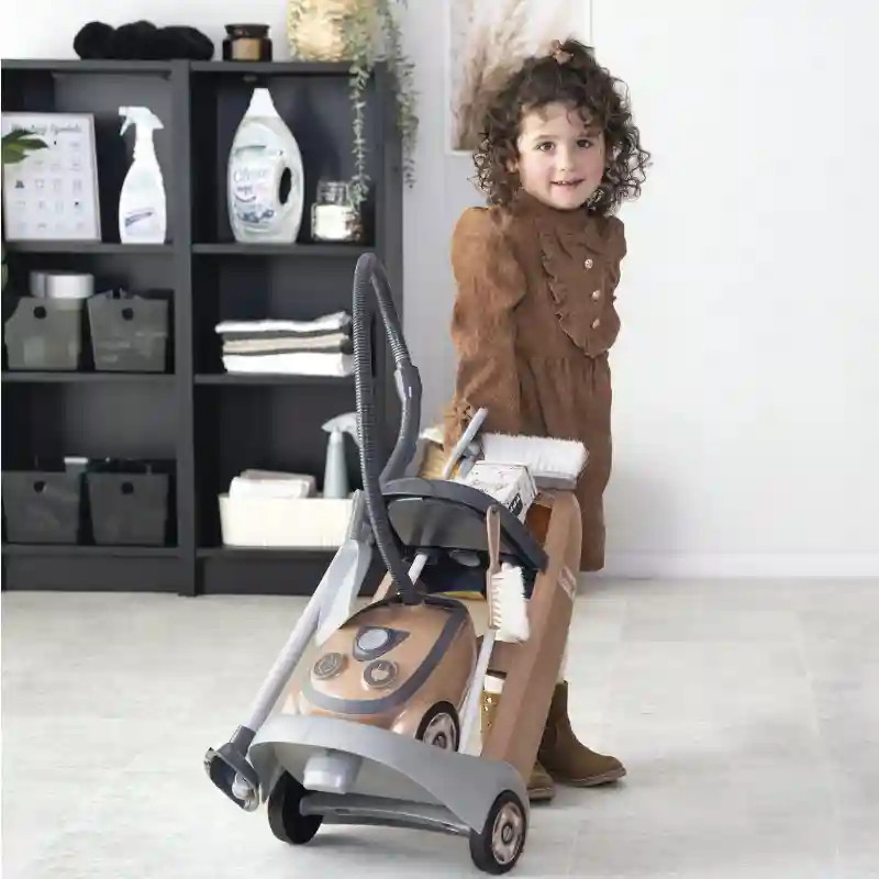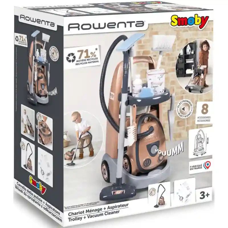 A Smoby játék gurulós takarítókocsi interaktív porszívóval készlet rengeteg kiegészítővel érkezik, hogy a kicsik is utánozhassák anyát és apát, miközben szórakoztató szerepjátékban vehetnek részt. A mellékelt Rowenta játékporszívó valósághű porszívóhangot ad ki, kompakt méretének és könnyű súlyának köszönhetően pedig már a 3 évesek is könnyedén kezelhetik. A készlet tartalmaz seprűt, lapátot, felmosót és tisztítószeres dobozokat, mindent, ami a nagytakarításhoz szükséges. A Smoby Franciaországban gyártott takarítókocsija 71%-ban újrahasznosított műanyagból készült, így nemcsak játék közben tesz jót, hanem a környezetnek is. Szuper ajándék kis házigazdáknak, akik imádnak segíteni a házimunkában és játék közben felfedezni a felnőttek világát. A játék porszívó tetején lévő gomb megnyomásakor zúgni kezd, akárcsak az igazi. A nagy méretű kerekenek köszönhetően könnyen irányítható. A Smoby porszívó 3 db LR44 gombelemmel működik, amit a csomagolás tartalmaz. A porszívó szívó hatással nem rendelkezik. A termék összeszerelést igényel.